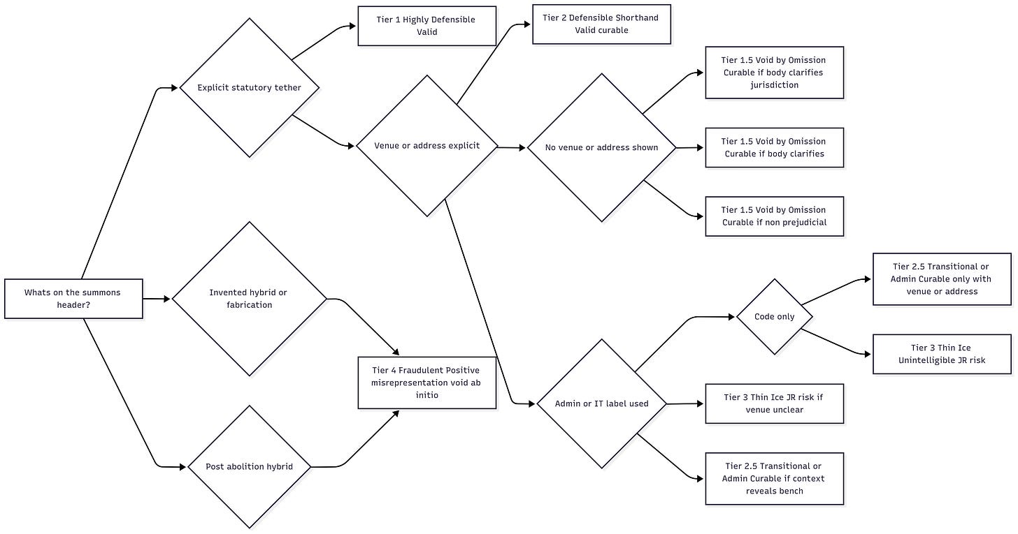I spent my Sunday producing a 20-page white paper on court naming. To my knowledge, it is the first attempt to map out the full taxonomy of naming schemes used in magistrates’ courts — from the constitutionally defensible to the constitutionally void, even drifting into criminal territory. The header image is a schematic of that framework, with the detailed paper presented below. Think of it as an “executable essay”: feed it into your own AI engine and you can generate a tailored jurisdictional challenge for your own circumstances.