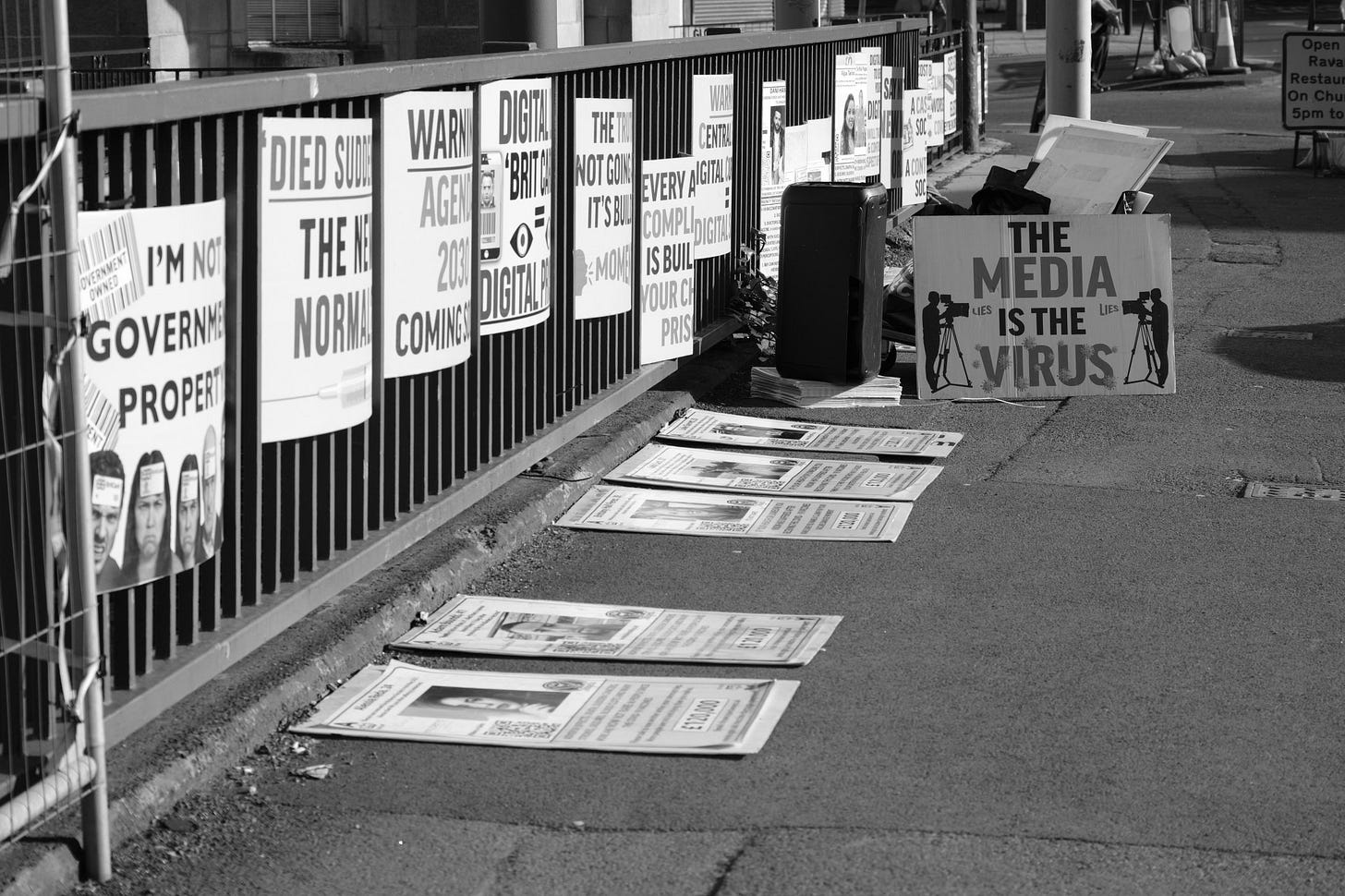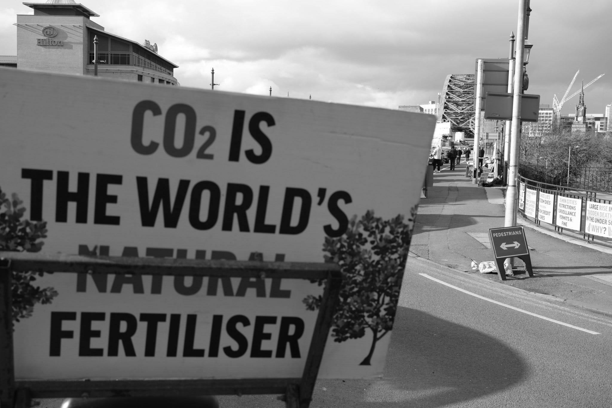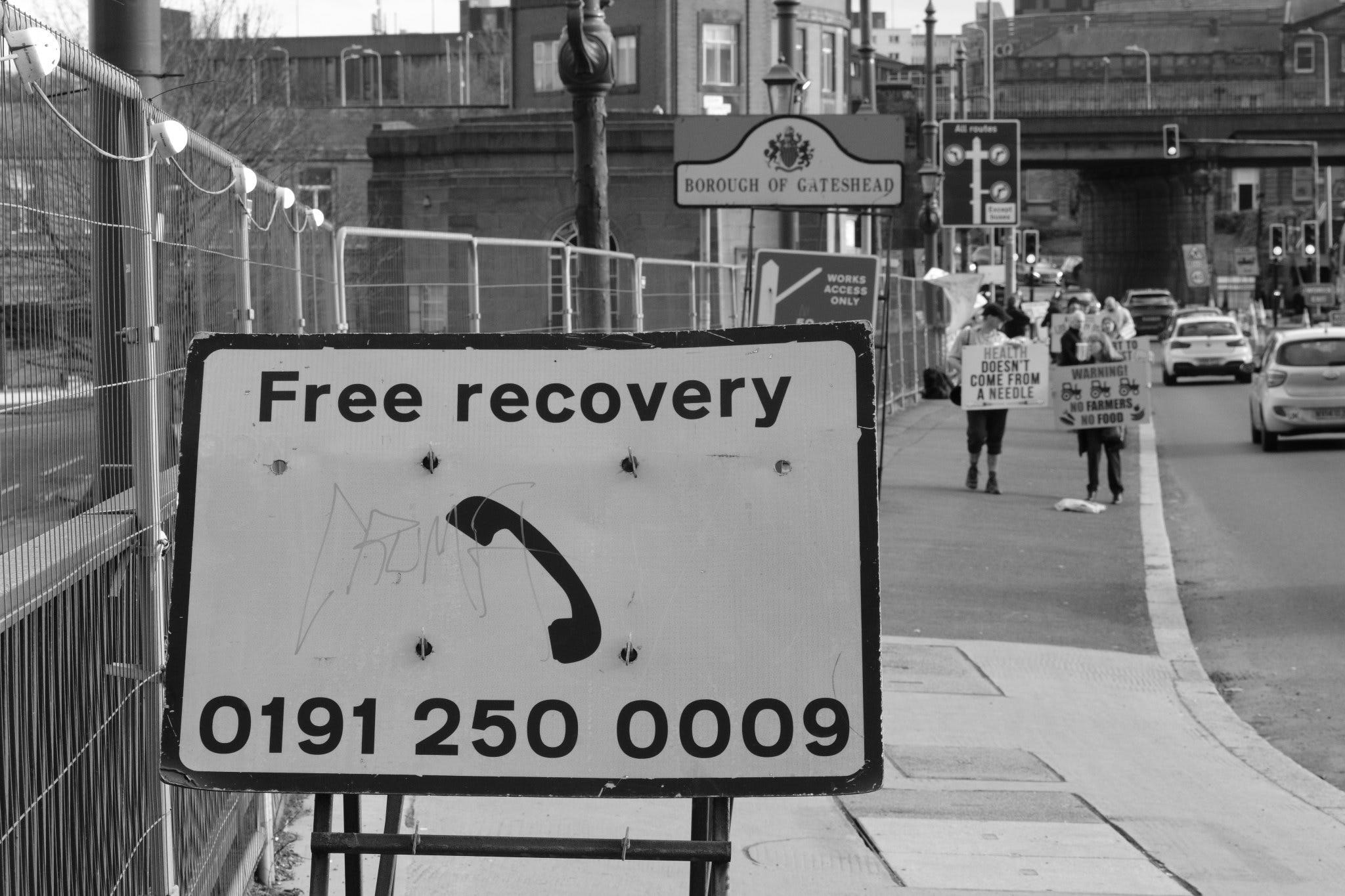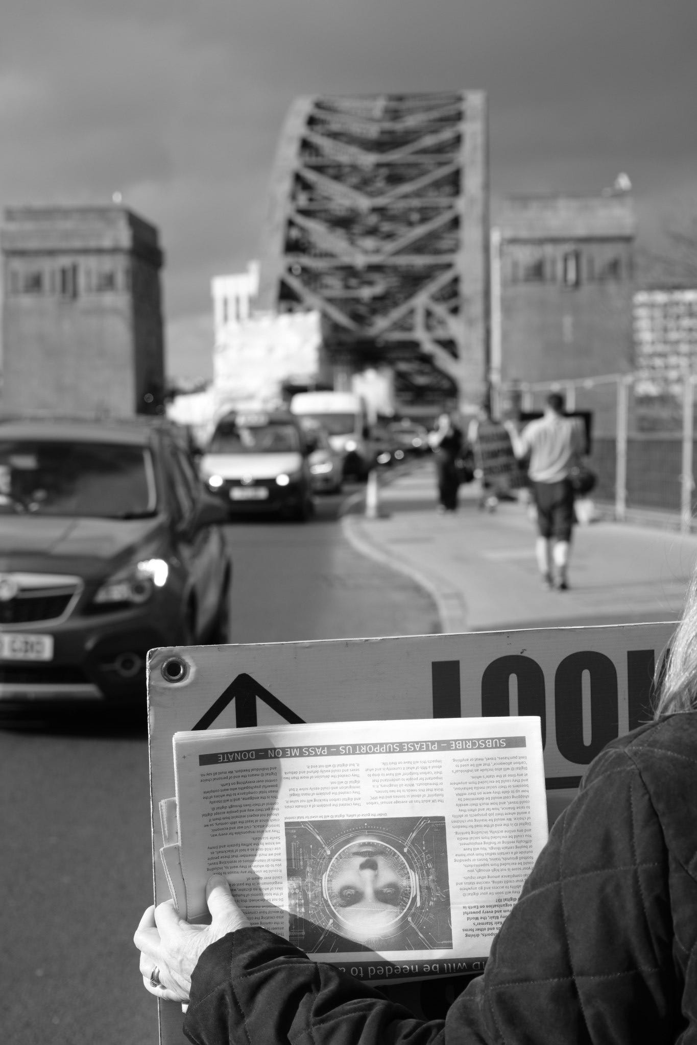 I calculated that I could just about afford the return train fare to Newcastle yesterday and still pay my rent while staying within my overdraft limit, so I decided to photograph one of the “Rebels on Roundabouts” events. People opposed to a bio-medical digital tyranny taking over society stand at the roadside with placards, hand out newspapers and flyers, and motorists who support the cause hoot their horns in solidarity. It is a different category of protest from a march or a rally outside a public building. I enjoy capturing these events as a record of contemporary history.