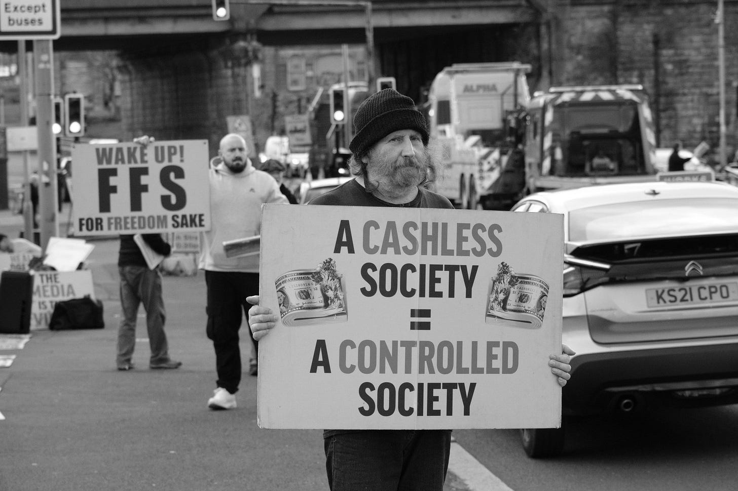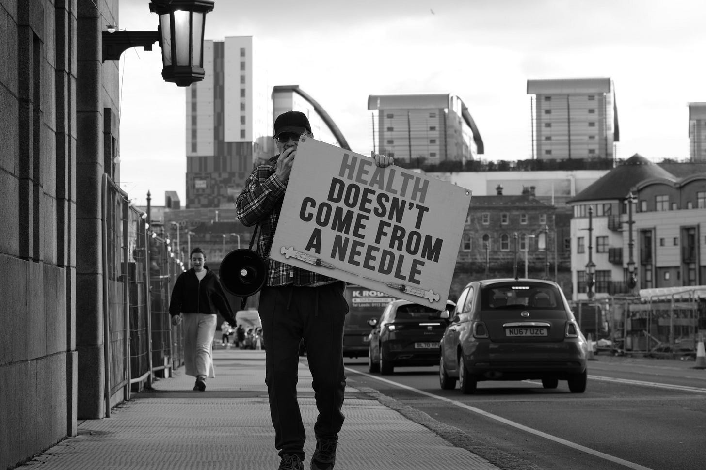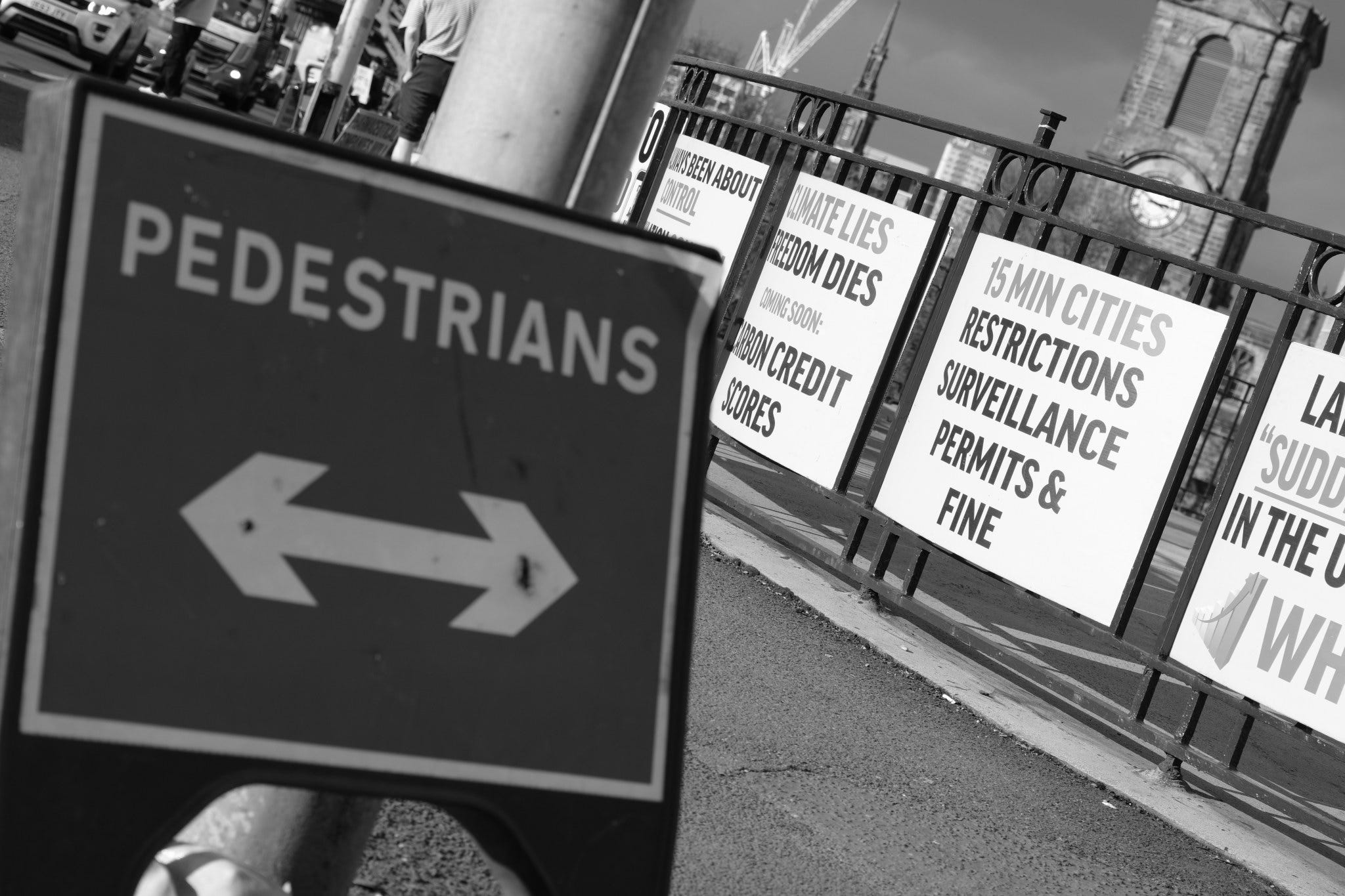 I calculated that I could just about afford the return train fare to Newcastle yesterday and still pay my rent while staying within my overdraft limit, so I decided to photograph one of the “Rebels on Roundabouts” events. People opposed to a bio-medical digital tyranny taking over society stand at the roadside with placards, hand out newspapers and flyers, and motorists who support the cause hoot their horns in solidarity. It is a different category of protest from a march or a rally outside a public building. I enjoy capturing these events as a record of contemporary history.