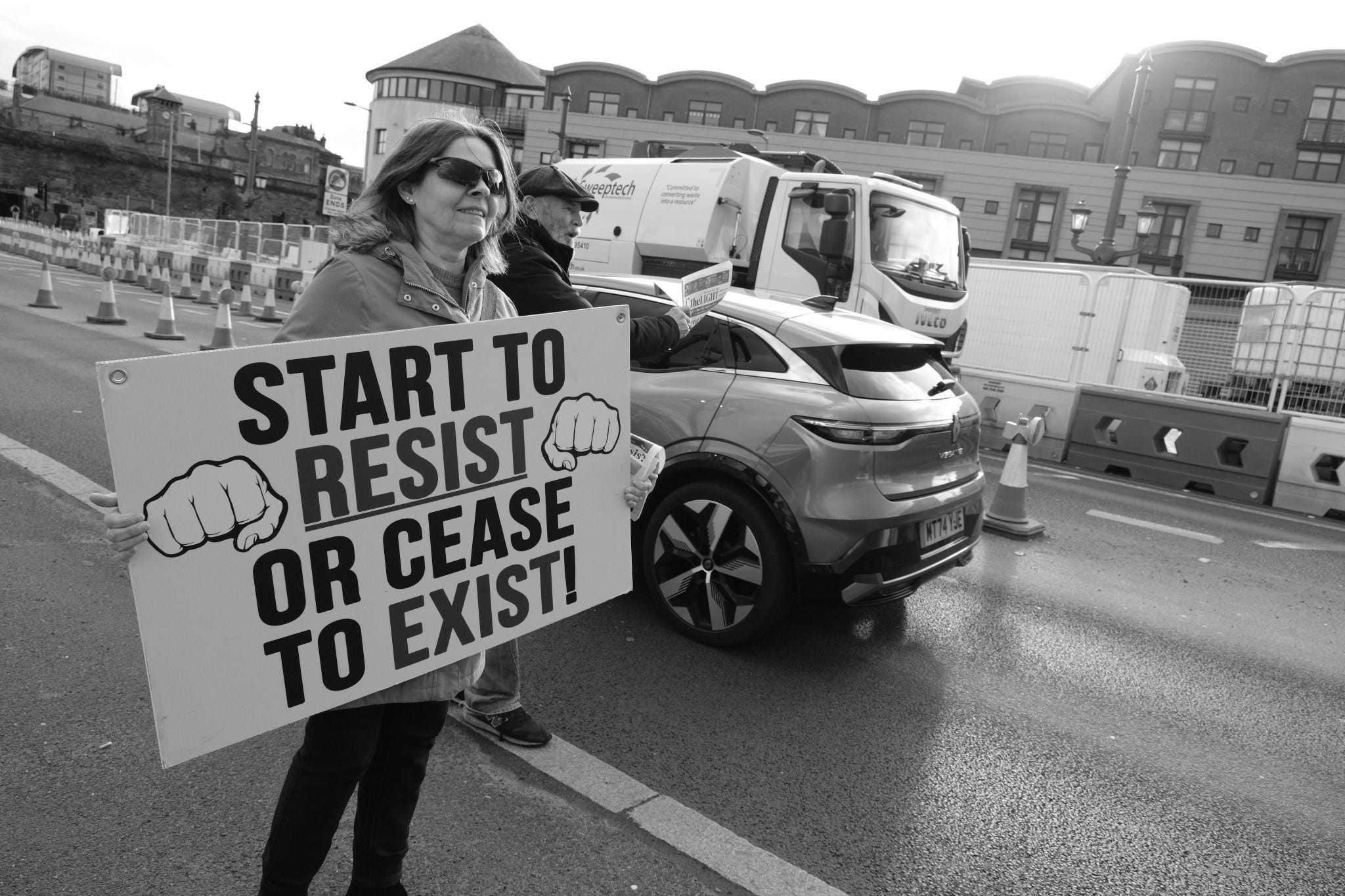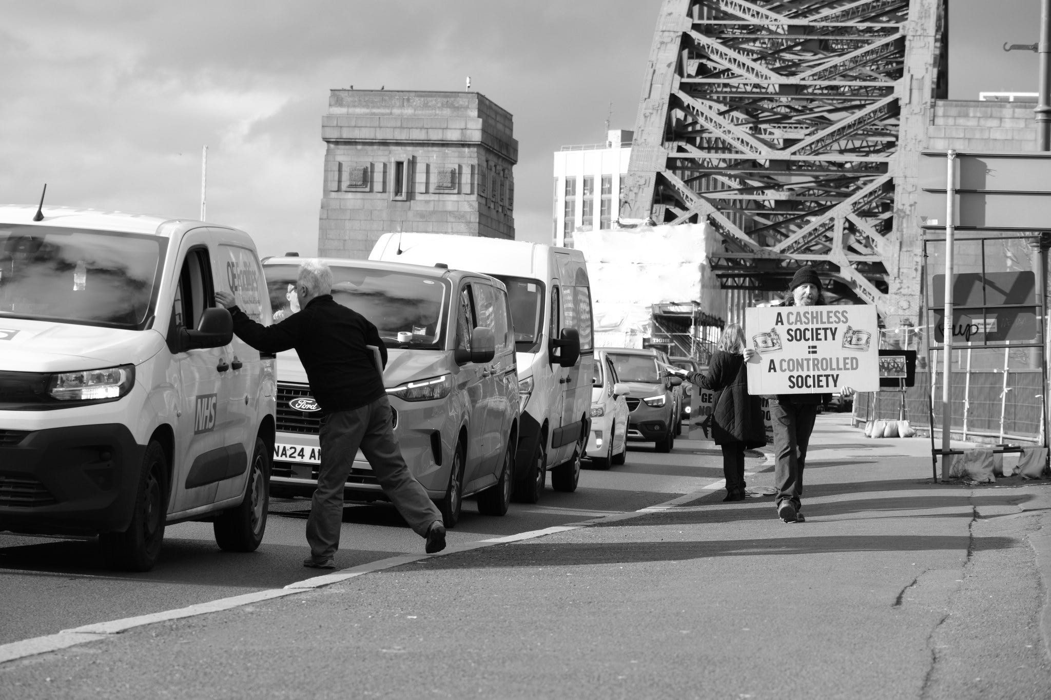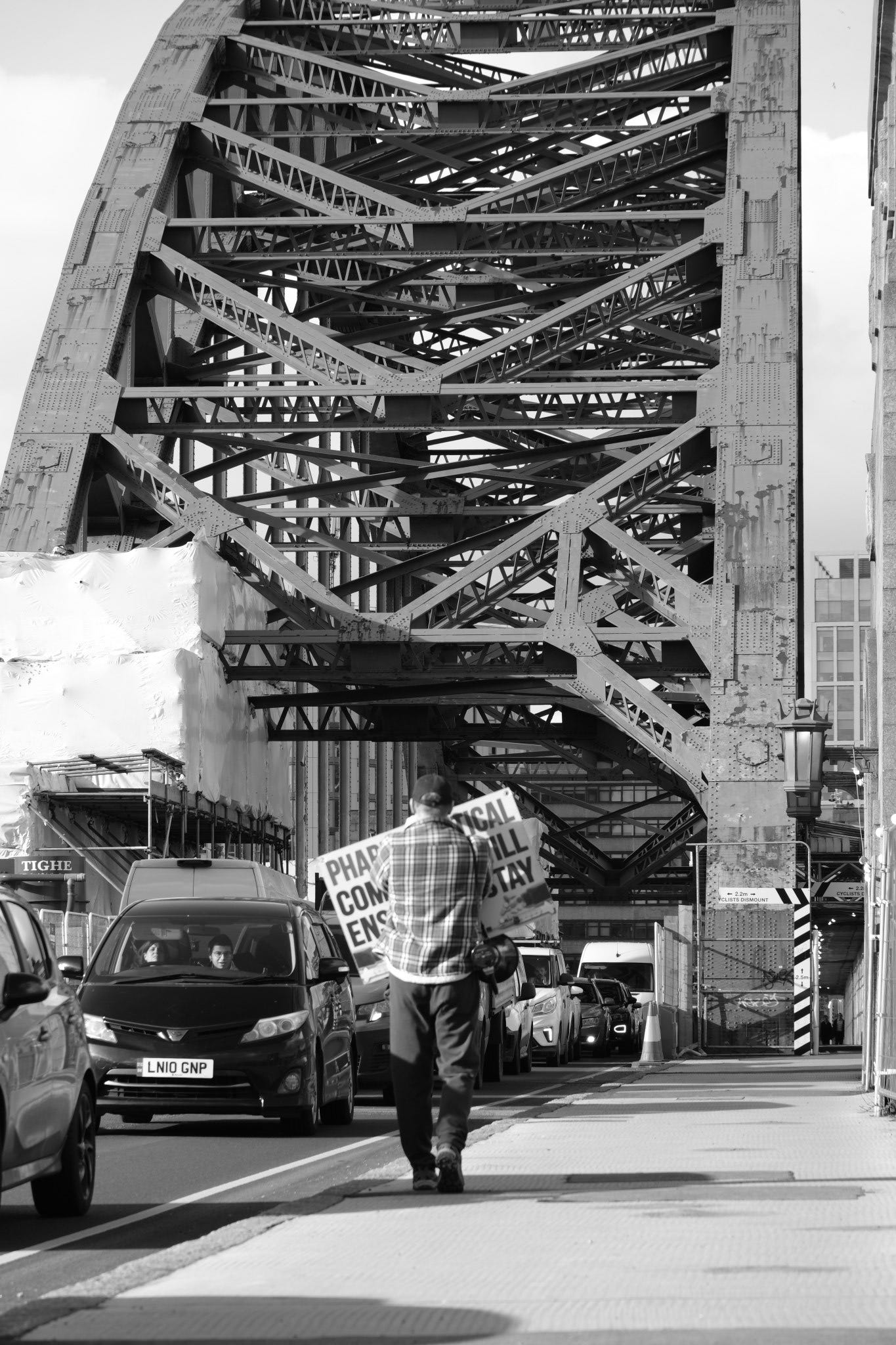 Orange men good: hi-vis dissent on a Newcastle bridge