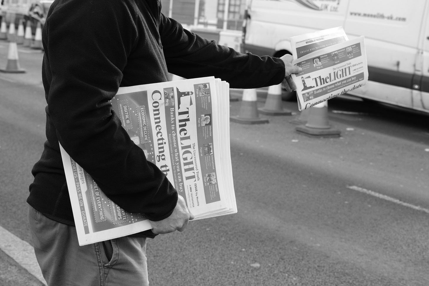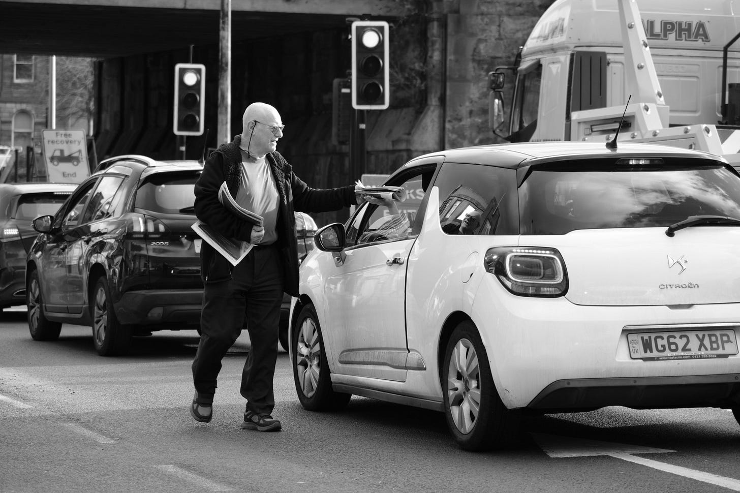 Newspapers being handed out to cars stopped at the lights. Once one car takes a paper, those behind have a propensity to follow.