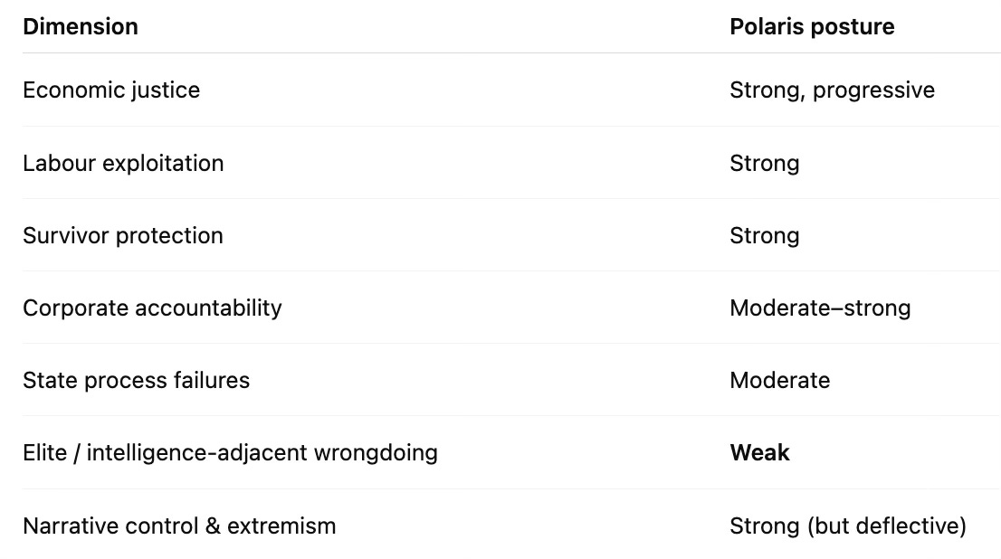 This is not the place to adjudicate those matters. It is sufficient to note that these framings are widely accepted within a progressive political and media milieu, and Polaris’s positioning in this regard is neither unusual nor remarkable. Indeed, the deliberate refusal to resolve questions of truth, and the decision instead to focus on when and how inquiry is brought to an end, goes to the heart of the present analysis.