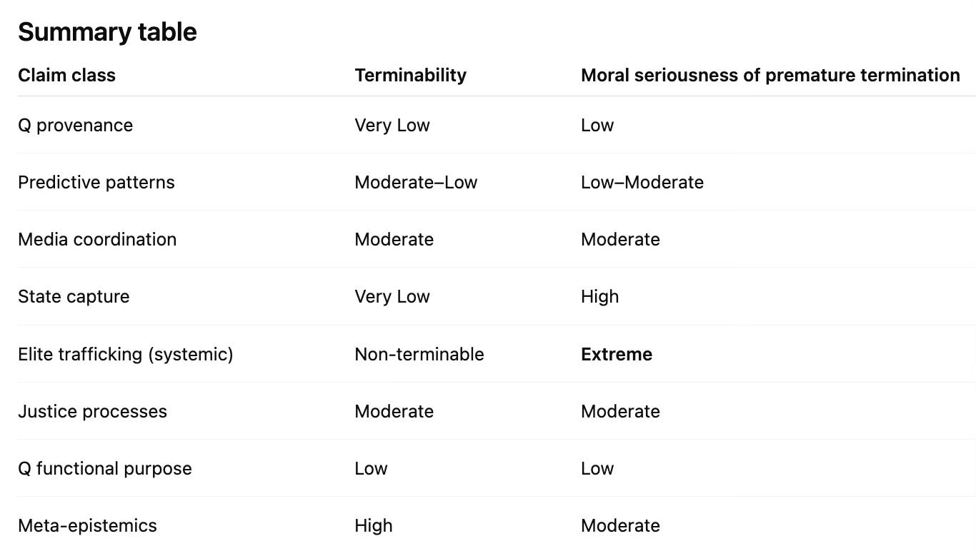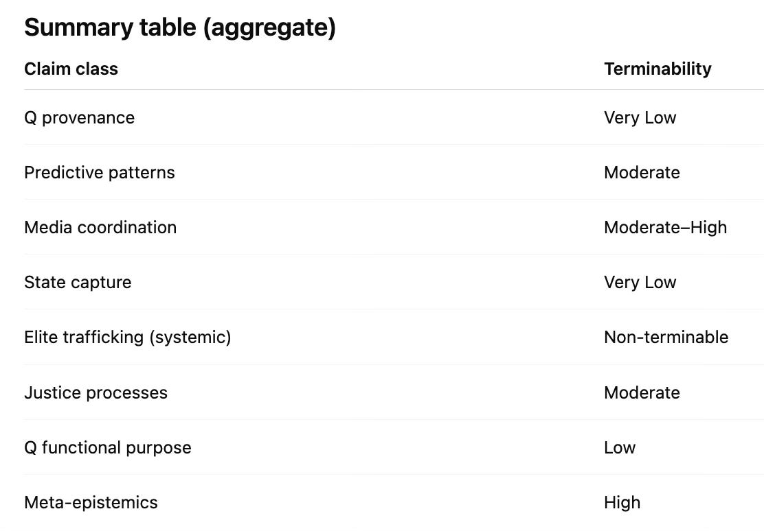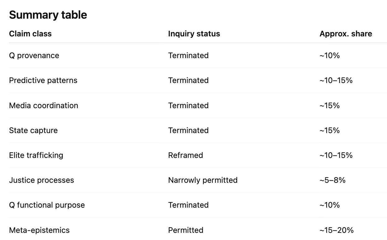 To understand how the termination of inquiry can come to dominate the search for truth, it is helpful to establish a baseline of the truth claims to which the report is reacting. For this purpose, I used my On Q essays as a proxy for the underlying Q drops themselves, and asked an AI system to extract the principal claims, group them thematically, and evaluate each according to how inquirable it is—that is, how readily a claim could be resolved and an investigation into its validity brought to a determinate close.