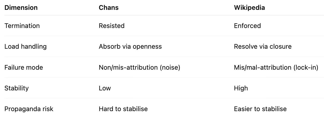 Systems like the chans cannot carry sustained social load because they refuse closure. Systems like Wikipedia can carry that load only by enforcing closure — and therefore will tend toward narratives that are socially stabilisable. This is not a failure of design or intent, but an inevitability of how attribution must terminate under pressure.