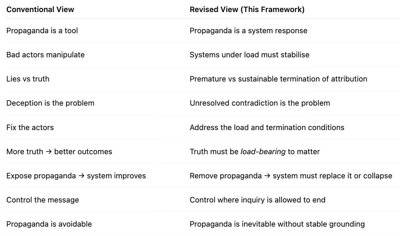 The reason is simple. Propaganda is not just persuasion; it is part of how the system stabilises itself under pressure. Remove it without replacing its function, and the system does not correct — it compensates, fragments, or escalates.