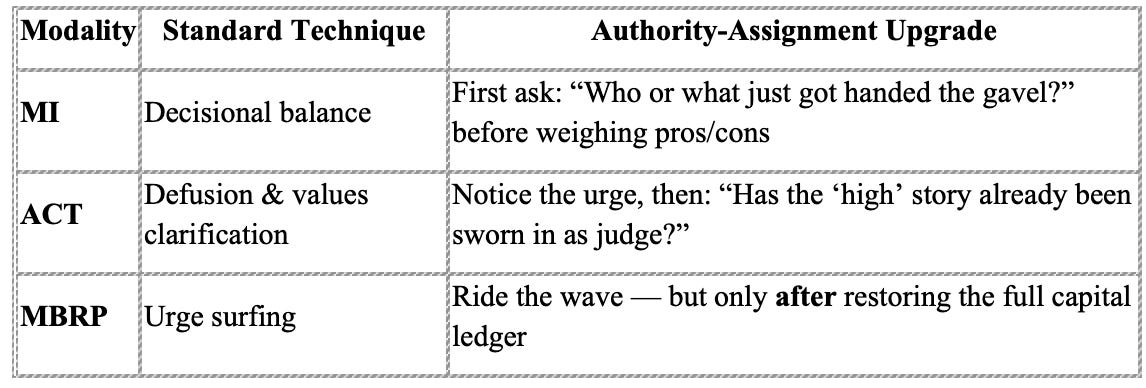Intervening at the level of authority—rather than behaviour alone—may offer a distinct and practical point of leverage in clinical work.